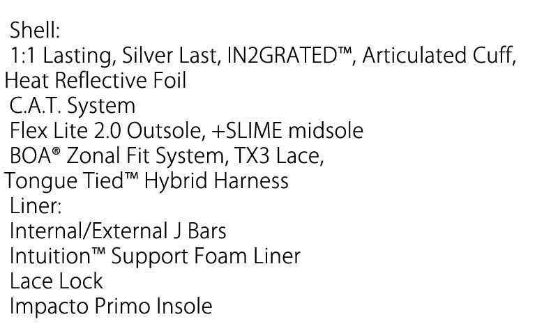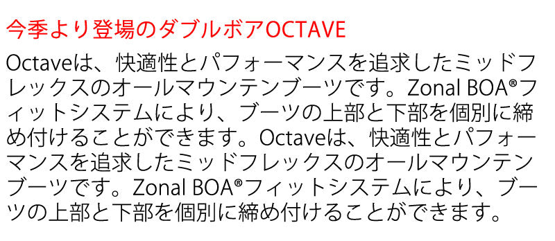 快適性とパフォーマンスを追求したミッドフレックスのオールマウンテンブーツです。Zonal Boaフィットシステムにより、ブーツ上部と下部を個別に締め付けることができます。OCTAVEは、快適性とパフォーマンスを追求したミッドフレックスオールマウンテンブーツです。 ブーツとバインディングの相性やフィッティング、サイズ感に関して等、ご不明な点があればお気軽にお問い合わせください。サイズ交換も当店在庫有りの範囲で対応可能ですので、詳しくはサイズ交換リンクをご確認下さい。 |