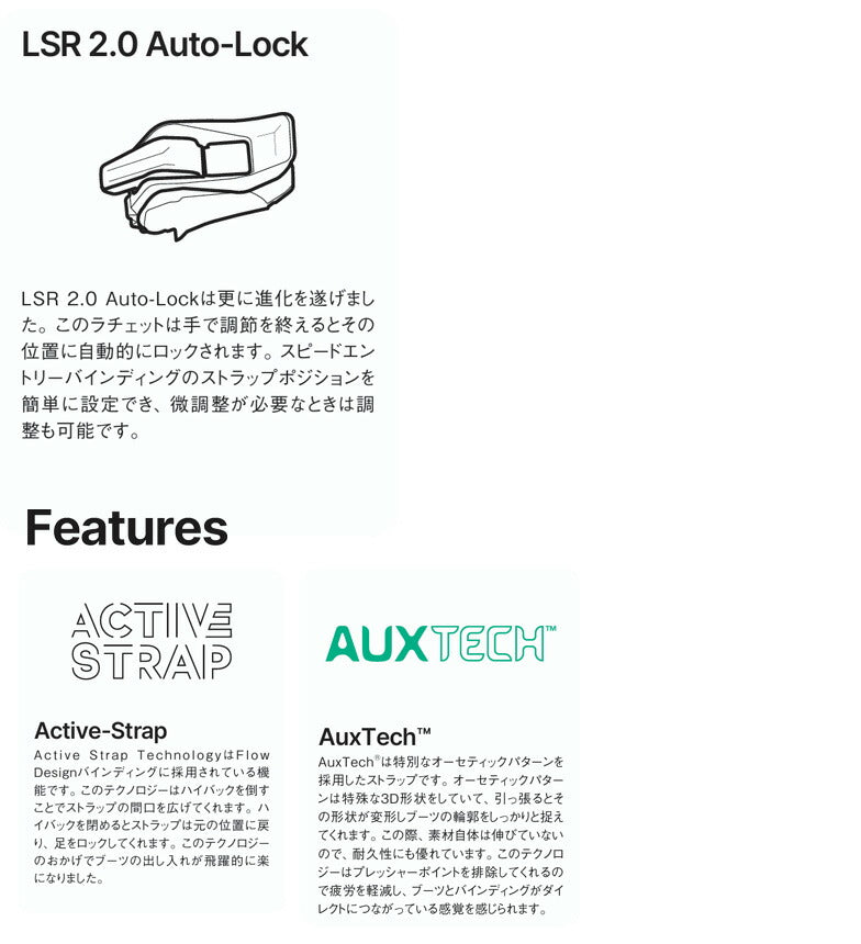 ※滑走での振動やストラップの着脱等でビスを使用している部分は緩んできますので、締り具合など滑走前に必ずご確認をお願いします。またご使用のブーツとストラップの調整をお願いいたします。調整が適切でない場合、負荷が集中し破損の原因となります。