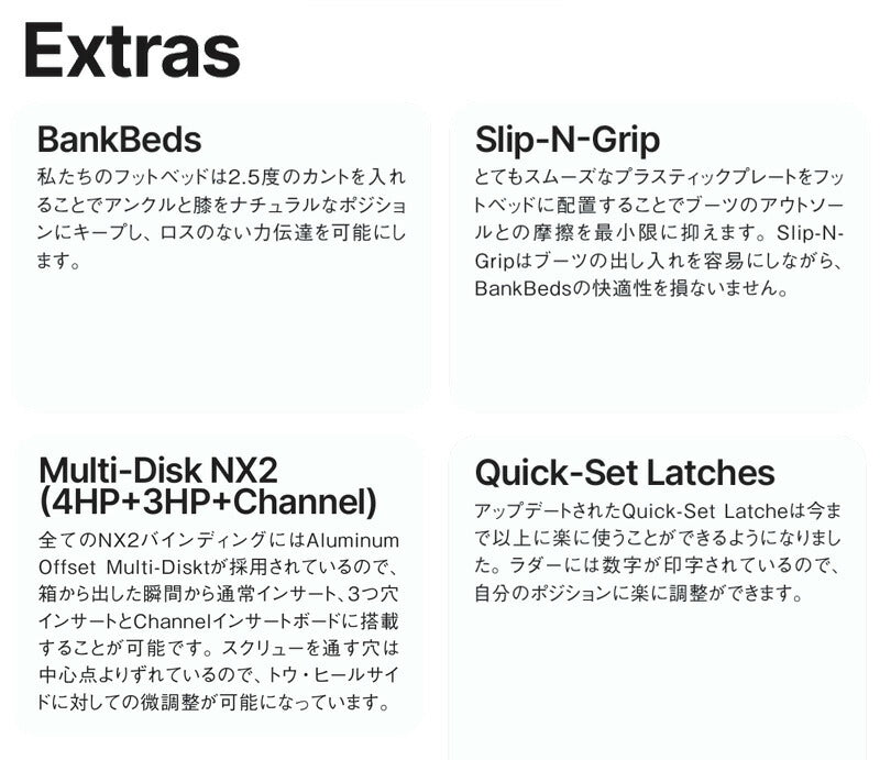 一日中快適なライディングを実現するのは、エクスパンデッドEVA素材のExo-Kushストラップと、バンプを吸収し自然な姿勢で効率的に機能するフルレングスのカント付きBankBedです。
