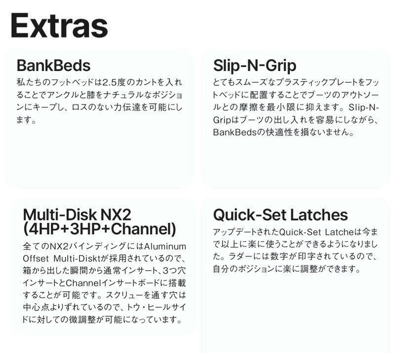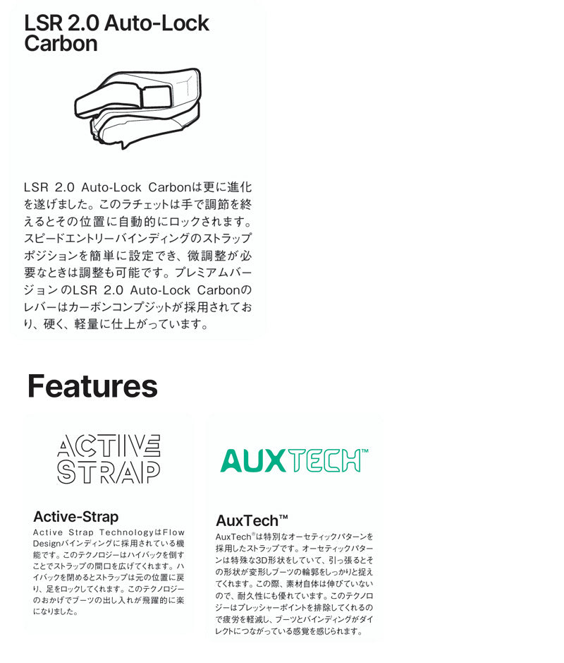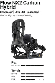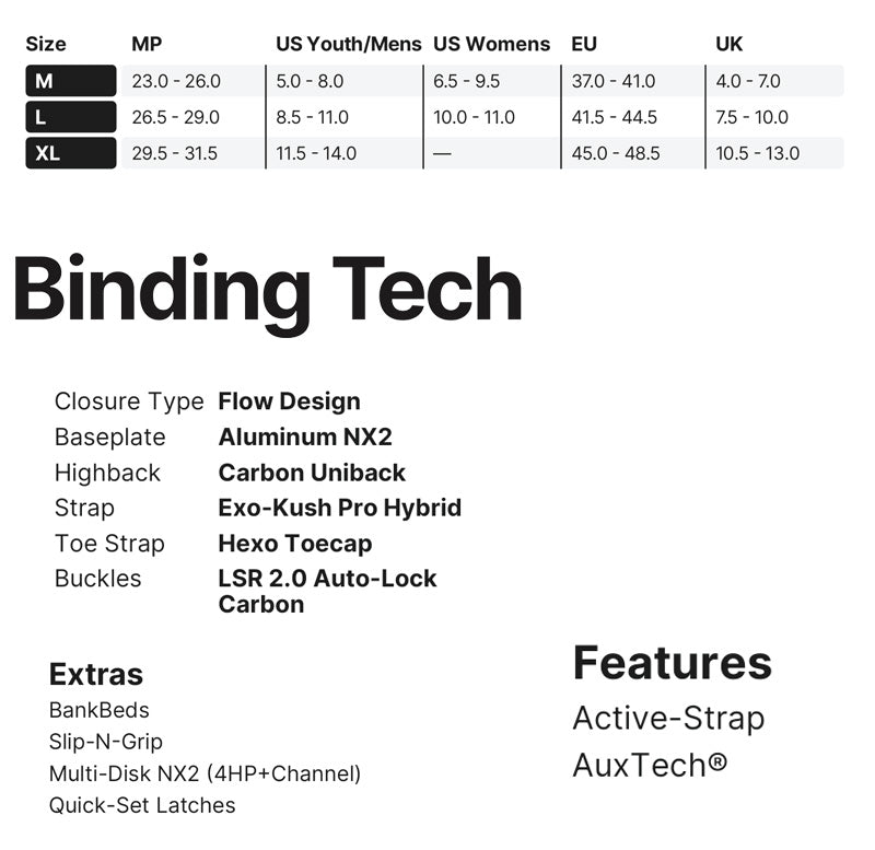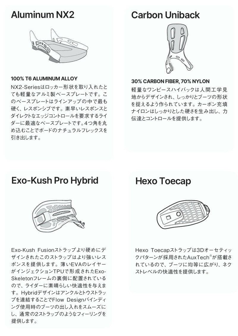 爆発的なパワー、ナイフエッジコントロール NX2-Carbonは、間違いなくFlow Designバインディング史上最もレスポンスに優れたモデルです。急斜面を攻めたり、レールカーブを駆け抜けたり、ハイパフォーマンスなスノーボードをこなすために設計された、超高剛性・軽量設計です。 伝説のNX2シャーシをベースに、複数のコンポーネントをアップグレードしました。 まずは、完璧なフィット感とヒールエッジの卓越したコントロール性を提供する、カーボン配合ナイロン製のシングルピース非対称ユニバック。 フリーライドを極めるライダーの願いが叶いました。 反転させ、裂く。 フローデザインは、エントリースピード以上のものを提供する。 そのユニークなケーブルシステムは、すべてのモデルにパワフルなフィーリングを与え、ユニークなフュージョンストラップや、伝説的な NX2のようなより硬いモデルでは、そのフィーリングがターボチャージされる。 数十年にわたり洗練されたこのバインディングは、あらゆるコンディションで自身を証明し、忠実なファン軍団を獲得してきた。 あなたもその仲間入りをする準備はできている? 行こう バインディングとブーツの相性やフィッティングに関して等、ご不明な点があればお気軽にお問い合わせください。 ※滑走での振動やストラップの着脱等でビスを使用している部分は緩んできますので、締り具合など滑走前に必ずご確認をお願いします。またご使用のブーツとストラップの調整をお願いいたします。調整が適切でない場合、負荷が集中し破損の原因となります。 |