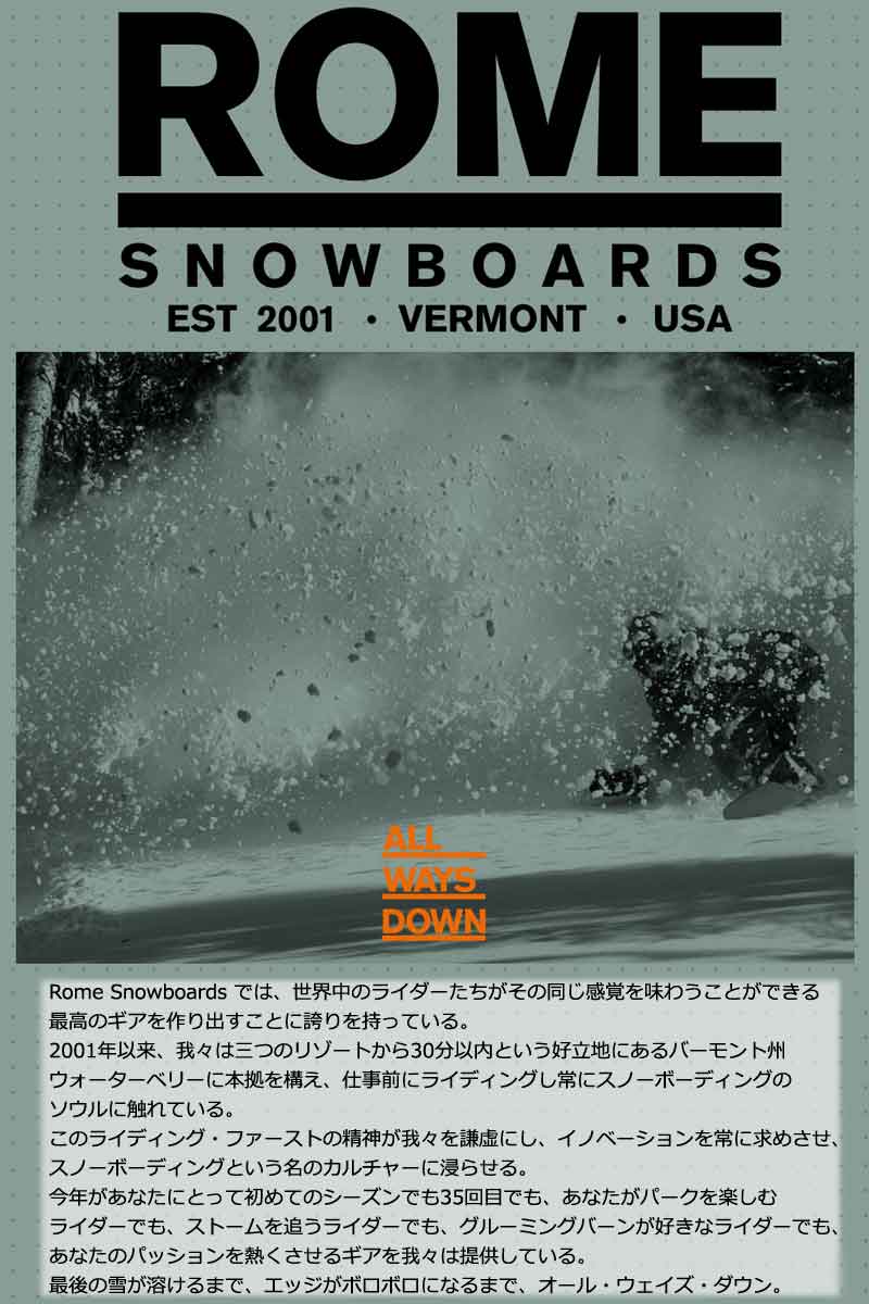 オールマウンテンでの快適性と 優れたアジャスト性能を女性ライダーにも Rome Snowboards では、世界中のライダーたちがその同じ感覚を味わうことができる最高のギアを作り出すことに誇りを持っている。 2001年以来、我々は三つのリゾートから30分以内という好立地にあるバーモント州ウォーターベリーに本拠を構え、仕事前にライディングし常にスノーボーディングのソウルに触れている。 このライディング・ファーストの精神が我々を謙虚にし、イノベーションを常に求めさせ、スノーボーディングという名のカルチャーに浸らせる。 今年があなたにとって初めてのシーズンでも35回目でも、あなたがパークを楽しむライダーでも、ストームを追うライダーでも、グルーミングバーンが好きなライダーでも、あなたのパッションを熱くさせるギアを我々は提供している。 最後の雪が溶けるまで、エッジがボロボロになるまで、オール・ウェイズ・ダウン。 バインディングとブーツの相性やフィッティングに関して等、ご不明な点があればお気軽にお問い合わせください。 ※滑走での振動やストラップの着脱等でビスを使用している部分は緩んできますので、締り具合など滑走前に必ずご確認をお願いします。またご使用のブーツとストラップの調整をお願いいたします。調整が適切でない場合、負荷が集中し破損の原因となります。