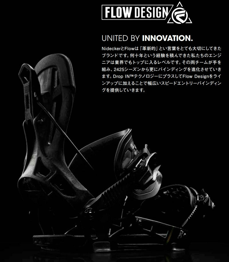 高度なフリーライドに最適 NideckerとFlowは「革新的」とい言葉をとても大切にしてきたブランドです。 何十年という経験を積んできた私たちのエンジニアは業界でもトップに入るレベルです。 その両チームが手を組み、24-25シーズンから更にバインディングを進化させていきます。 Drop IN?テクノロジーにプラスしてFlow Designをラインアップに加えることで幅広いスピードエントリーバインディングを提供していきます。 1887年に創立したNidecker 社は1912年からスキー製作をスタートし、1984年に初めてスノーボードをリリース。 革新的な技術を採用したボードをマーケットに投入してきたNideckerは、高い技術力でスノーボードを躍進させてきた。 世界的ブランドを多数傘下に置くビックカンパニー。 FLOWビンディングがNIDECKERとして名前が変わりました。 バインディングとブーツの相性やフィッティングに関して等、ご不明な点があればお気軽にお問い合わせください。 ※滑走での振動やストラップの着脱等でビスを使用している部分は緩んできますので、締り具合など滑走前に必ずご確認をお願いします。またご使用のブーツとストラップの調整をお願いいたします。調整が適切でない場合、負荷が集中し破損の原因となります。