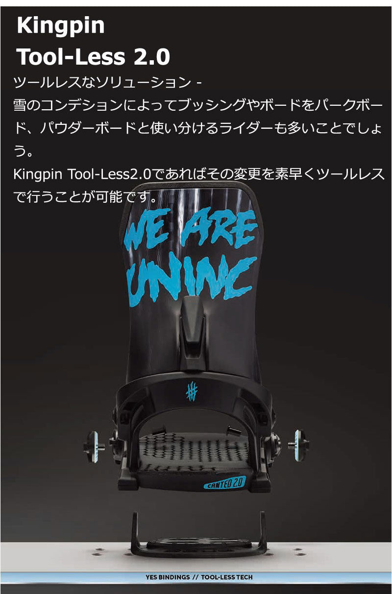 ※標準のブッシングはMEDIUMとなります。 24-25モデルからYES,LOBSTER,NOW BINDINGは統合され「YES」となり、NOW BINDINGはYES BINDINGとして始動します。 バインディングとブーツの相性やフィッティングに関して等、ご不明な点があればお気軽にお問い合わせください。 ※滑走での振動やストラップの着脱等でビスを使用している部分は緩んできますので、締り具合など滑走前に必ずご確認をお願いします。またご使用のブーツとストラップの調整をお願いいたします。調整が適切でない場合、負荷が集中し破損の原因となります。