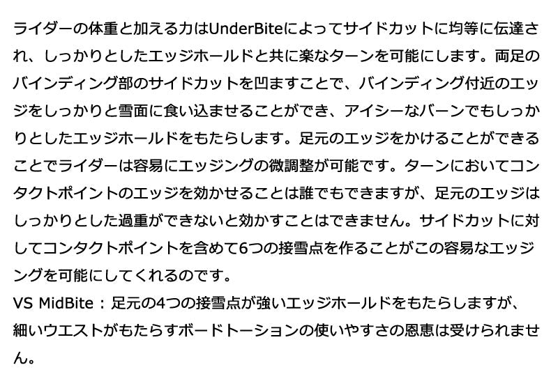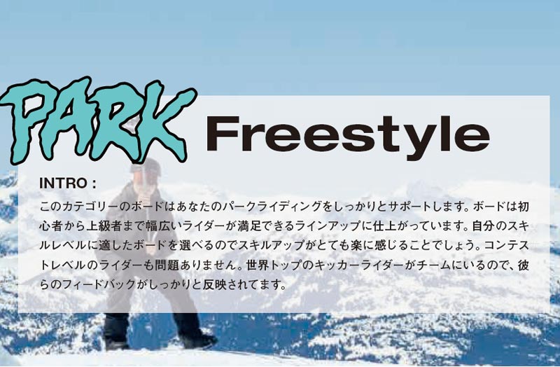 | 滑走適正スタイル | 1.フリーラン 2.カービング 3.ワンメイク(キッカー) 4.ジブトリック(BOX&レール) (スタイルや技術によって変化します) |