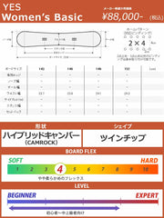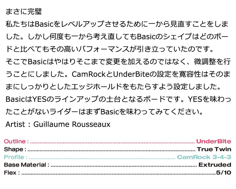 まさに完璧 私たちはBasicをレベルアップさせるために一から見直すことをしました。しかし何度も一から考え直してもBasicのシェイプはどのボードと比べてもその高いパフォーマンスが引き立っていたのです。 そこでBasicはやはりそこまで変更を加えるのではなく、微調整を行うことにしました。 CamRockとUnderBiteの設定を寛容性はそのままにしっかりとしたエッジホールドをもたらすよう設定しました。BasicはYESのラインアップの土台となるボードです。 YESを味わったこ とがないライダーはまずBasicを味わってみてください。 Artist : Guillaume Rousseaux ※ソールカラーは画像以外で文字部とソール全体のカラーが反転したものがあります。アソートになっておりますのでご選択が出来ないことをご了承くださいませ。 しっかりとしたメンテナンス施行を行わせて頂いておりますので、メンテナンス無しをお選びいただいた場合より当店加工のBASIC & EXPERTベースメンテナンスもご希望の際は、通常発送より2~4日後の発送となります。 多少お時間頂きます事をご了承ください。 |