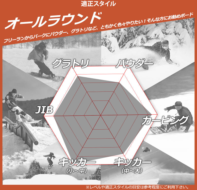 | 適正スタイル | 1.フリーラン2.カービング3.ワンメイク(キッカー)4.ジブトリック(BOX&レール) | ||