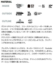 T-DECKの実績は、語りきれないほど十分にあります。初級~中級ボードの中で非常に評価が高く 、自信を持って勧めることができます。我々が持つテクノロジーを惜しみなく落とし込んでいるため、ソフトフレックスで軽くて扱いやすいとくればチームからの熱視線がないわけがないです。ハニカムインサイド&V-ダブルキャンバー搭載でコスパが抜群に良いです。いろんなことにチャレンジしたいとき、そのための勇気と準備が必要で人は不安になりますが、このボードがあれば自信が湧くことでしょう。年間滑走日数が少なくても十分満足できることを約束します。