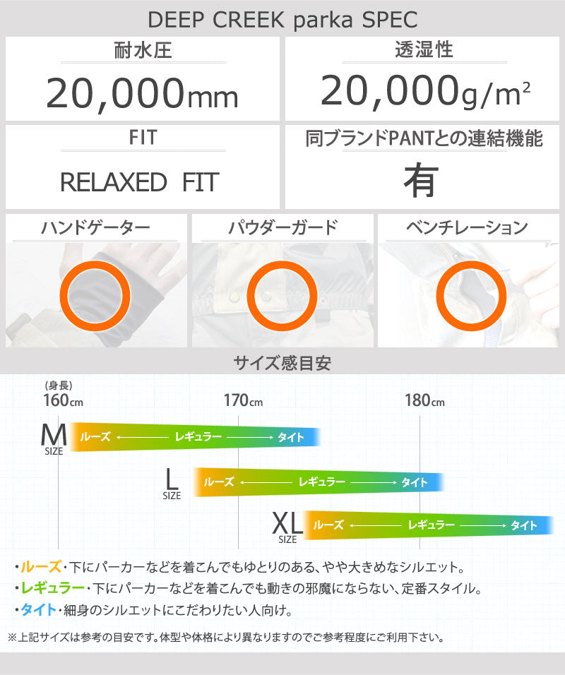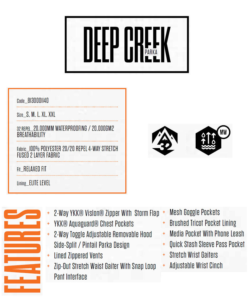 Deep Creek Parkaはスタイルを出したいライダー達から人気の高いモデルです。 防水/透湿20,000mmを誇り、機能性、デザイン性共に優れている点がChris Bradshawのお気に入り。 ※こちらはジャケットのみの販売となり、上下セット販売ではございませんのでご注意ください。 ※掲載写真の色合いは、PCモニター環境や撮影時の光環境により実物と若干違う可能性もございますのでご了承ください。 サイズ感や生地感などご不明点ございましたらお気軽にお問い合わせください。