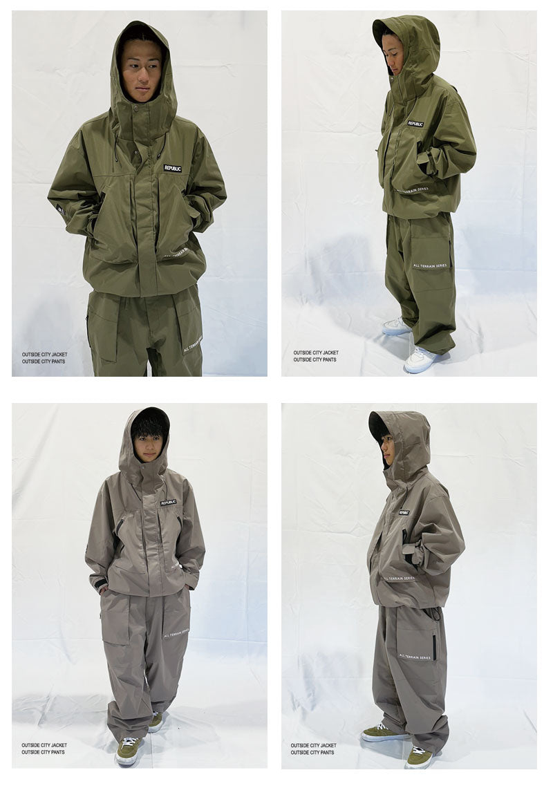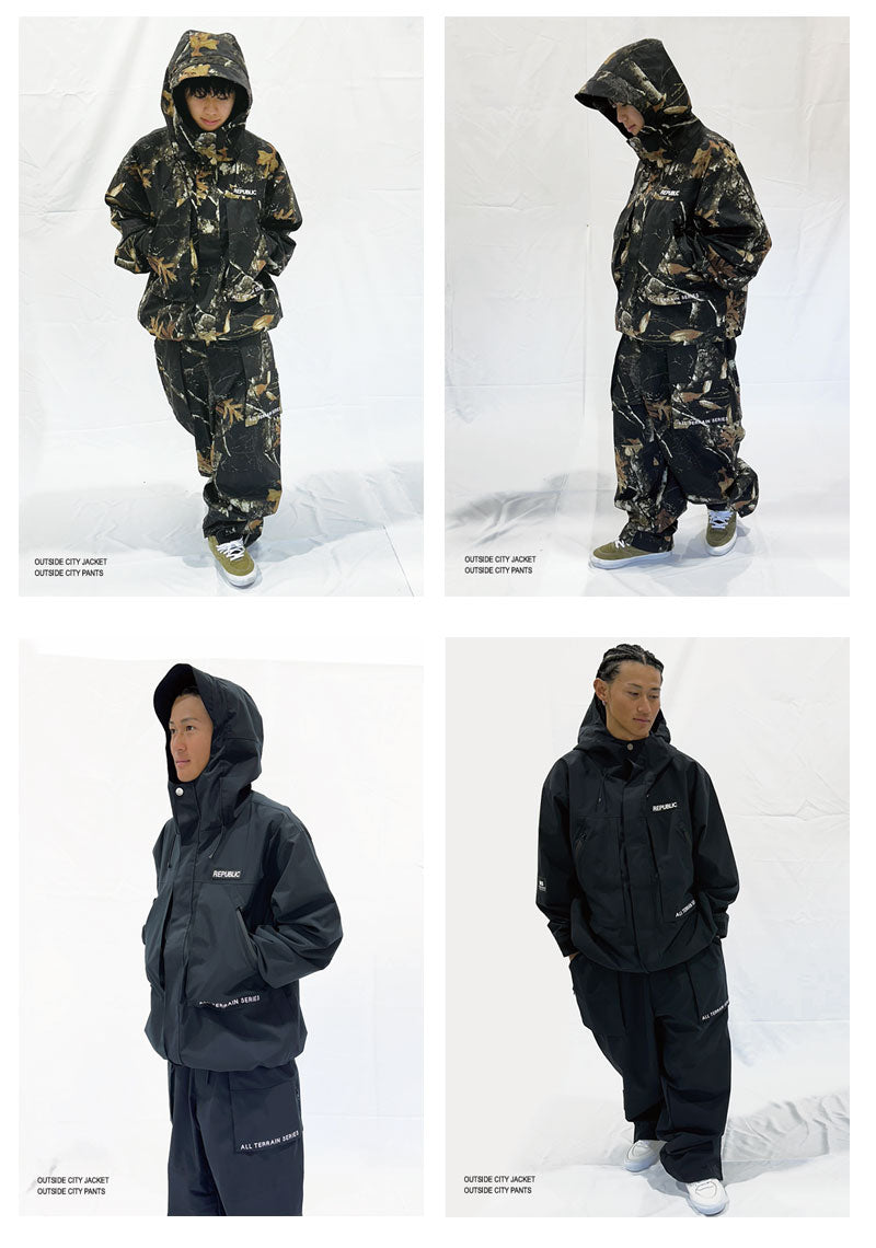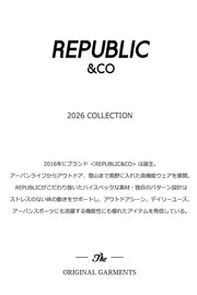 REPUBLICがこだわり抜いたハイスペックな素材・独自のパターン設計はストレスのない体の動きをサポートし、アウトドアシーン、デイリーユース、アーバンスポーツにも活躍する機能性にも優れたアイテムを発信している。