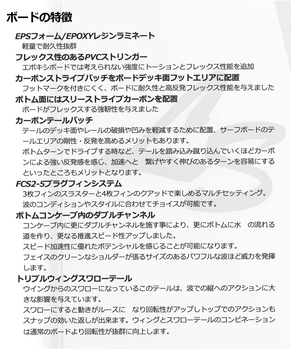 | フィンシステム | ・5フィンシステム ・FCS2フィンボックス ※フィンは付属しません。 |