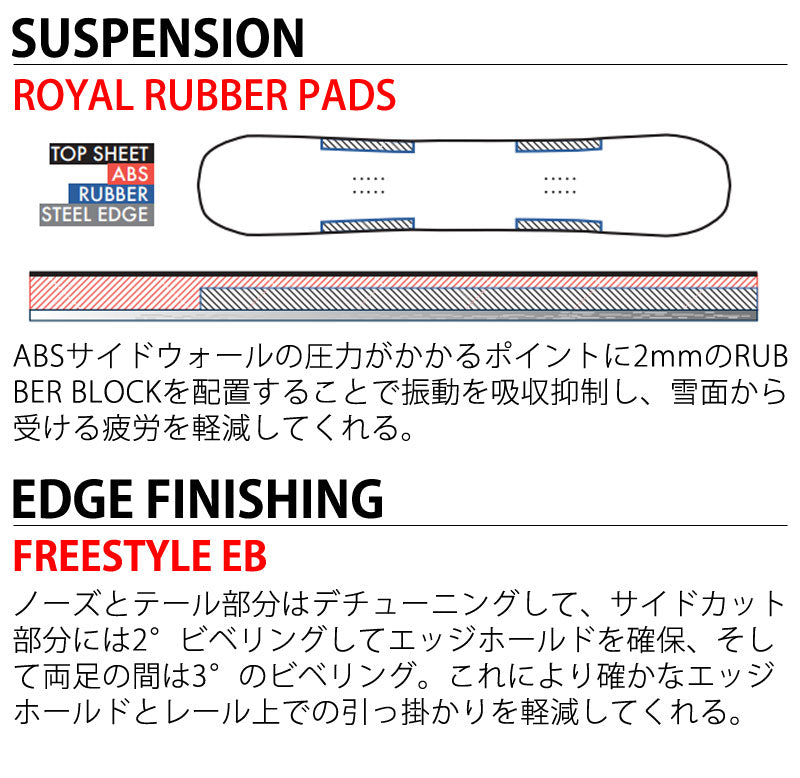 コメント Sleepwalkerはトミー・ゲズメのライディングスタイルを象徴したパーク&ジブボードです。ミッドソフトフレックスとロックアウトキャンバーの組み合わせがレールにロックし、ジャンプにはポップの遊び心を提供します。足元にはロイヤルラバーパッドを配置し、スムーズなライディングとサイドウォールの破損に対する強度を高めています。