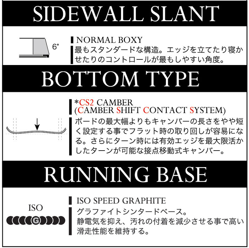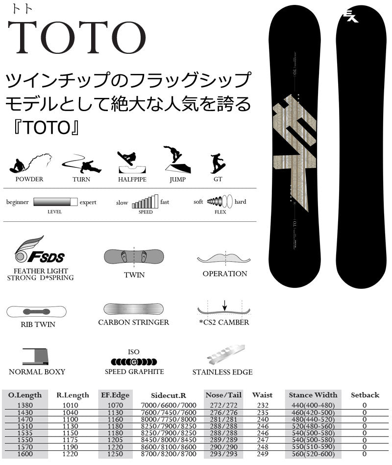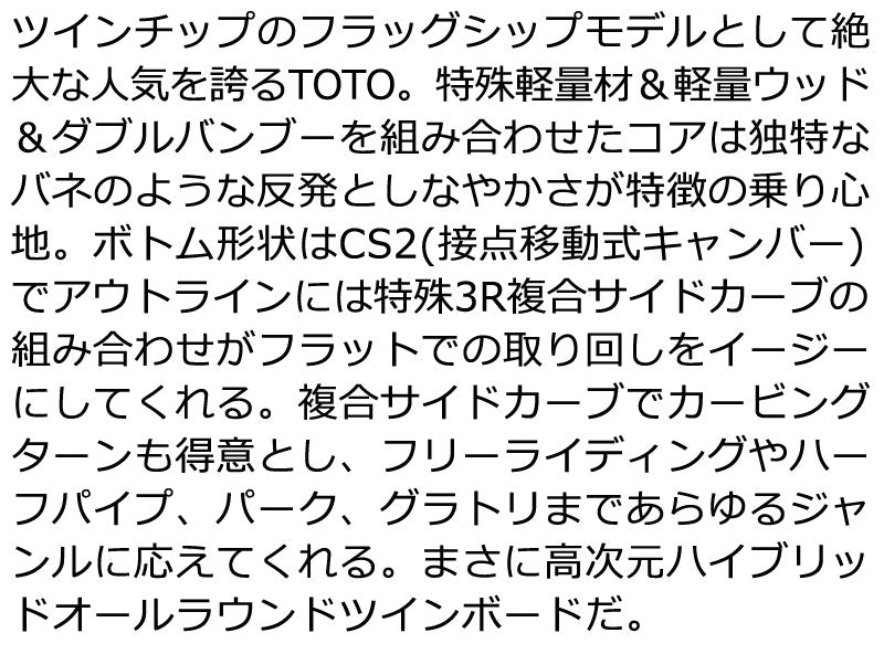 コメント ツインチップのフラッグシップモデルとして絶大な人気を誇るTOTO。特殊軽量材&軽量ウッド&ダブルバンブーを組み合わせたコアは独特なバネのような反発としなやかさが特徴の乗り心地。ボトム形状はCS2(接点移動式キャンバー)でアウトラインには特殊3R複合サイドカーブの組み合わせがフラットでの取り回しをイージーにしてくれる。複合サイドカーブでカービングターンも得意とし、フリーライディングやハーフパイプ、パーク、グラトリまであらゆるジャンルに応えてくれる。まさに高次元ハイブリッドオールラウンドツインボードだ。