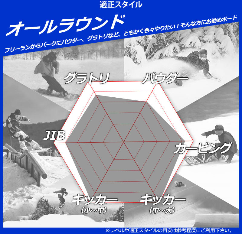 適正スタイル 1.カービング2.フリーラン3.ワンメイク(キッカー)4.ジブトリック(BOX&レール)