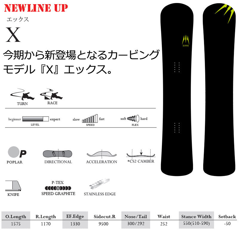 今期から新登場となるカービングモデル『X』エックス。Xに求めたのはスムーズターンとターンスピードだ。そのシェイプはLEGITのボトムライン×RRRのサイドライン×RRのターンの抜けの良さをミックスさせシングルサイドカーブで融合させた。切り返しスピードも求めて敢えてワイドには設定せずよりスムーズで速い切り返しが可能だ。TOPシートには振動吸収にも優れるP-TEXを採用しメタル無しでも安定感とエッジグリップを兼ね備える。フリーカービングやテクニカル戦、フリースタイルゲート等あらゆるジャンルに対応するカービングモデルの登場。 しっかりとしたメンテナンス施行を行わせて頂いておりますので、メンテナンス無しをお選びいただいた場合より当店加工のBASIC & EXPERTベースメンテナンスもご希望の際は、通常発送より2~4日後の発送となります。 多少お時間頂きます事をご了承ください。 |