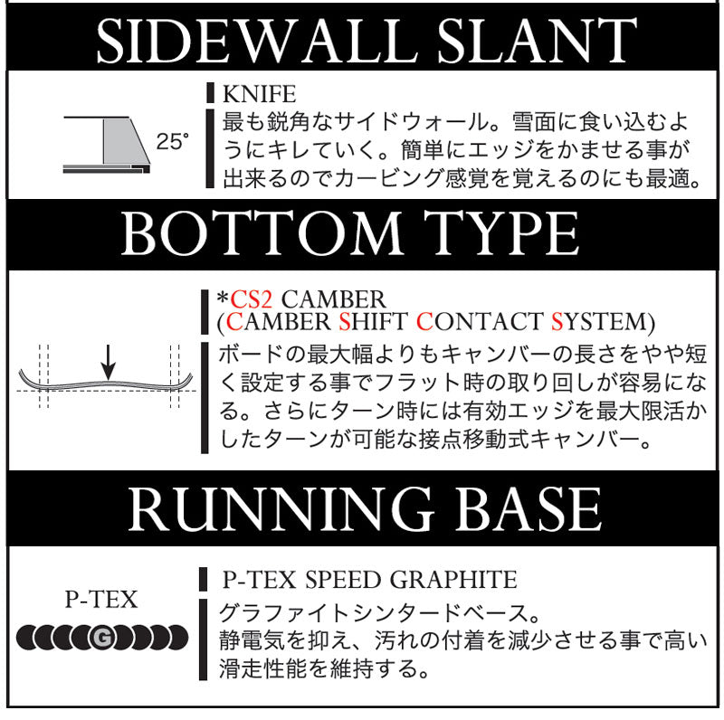 | 形状 | ハイブリッドキャンバー(CS2 CAMBER)ディレクショナル |