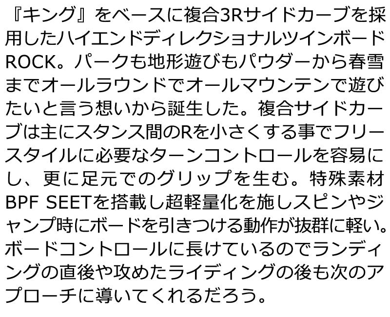 『キング』をベースに複合3Rサイドカーブを採用したハイエンドディレクショナルツインボードROCK。パークも地形遊びもパウダーから春雪までオールラウンドでオールマウンテンで遊びたいと言う想いから誕生した。複合サイドカーブは主にスタンス間のRを小さくする事でフリースタイルに必要なターンコントロールを容易にし、更に足元でのグリップを生む。特殊素材BPF SHEETを搭載し超軽量化を施しスピンやジャンプ時にボードを引きつける動作が抜群に軽い。ボードコントロールに長けているのでランディングの直後や攻めたライディングの後も次のアプローチに導いてくれるだろう。 しっかりとしたメンテナンス施行を行わせて頂いておりますので、メンテナンス無しをお選びいただいた場合より当店加工のBASIC & EXPERTベースメンテナンスもご希望の際は、通常発送より2~4日後の発送となります。 多少お時間頂きます事をご了承ください。 |
