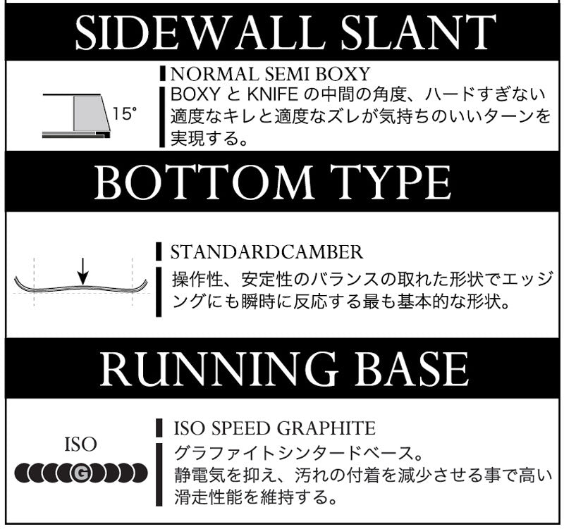 | 滑走適正スタイル | 1.カービング 2.フリーラン 3.ワンメイク(キッカー) 4.ジブトリック(BOX&レール) (スタイルや技術によって変化します) |