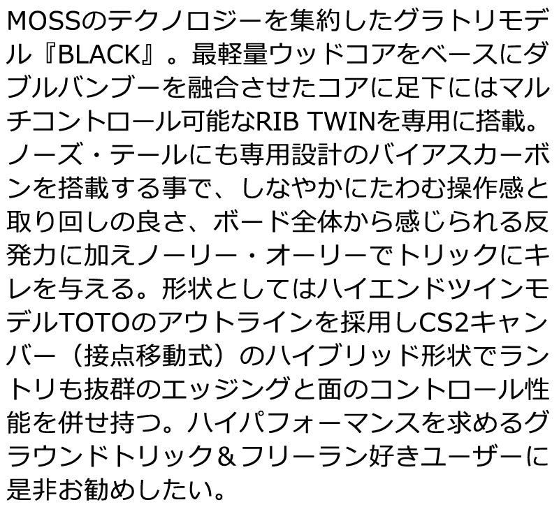 MOSSのテクノロジーを集約したグラトリモデル『BLACK』。最軽量ウッドコアをベースにダブルバンブーを融合させたコアに足下にはマルチコントロール可能なRIB TWINを専用に搭載。ノーズ・テールにも専用設計のバイアスカーボンを搭載する事で、しなやかにたわむ操作感と取り回しの良さ、ボード全体から感じられる反発力に加えノーリー・オーリーでトリックにキレを与える。形状としてはハイエンドツインモデルTOTOのアウトラインを採用しCS2キャンバー(接点移動式)のハイブリッド形状でラントリも抜群のエッジングと面のコントロール性能を併せ持つ。ハイパフォーマンスを求めるグラウンドトリック&フリーラン好きユーザーに是非お勧めしたい。 しっかりとしたメンテナンス施行を行わせて頂いておりますので、メンテナンス無しをお選びいただいた場合より当店加工のBASIC & EXPERTベースメンテナンスもご希望の際は、通常発送より2~4日後の発送となります。 多少お時間頂きます事をご了承ください。 |