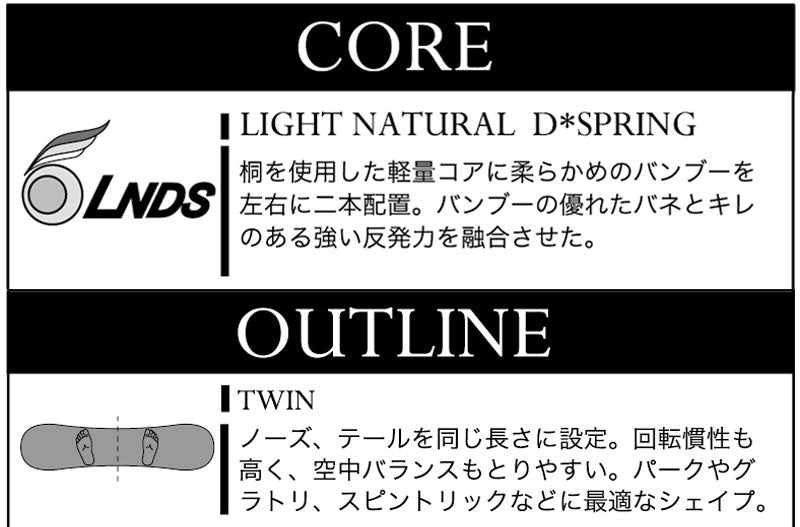 | 滑走適正スタイル | 1.グラトリ(グランドトリック) 2.フリーラン 3.カービング 4.ジブトリック(BOX&レール) (スタイルや技術によって変化します) |