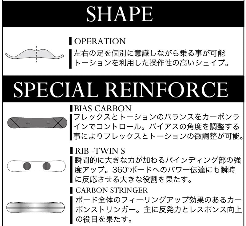 | 形状 | ハイブリッドキャンバー | シェイプ | ツインチップ |