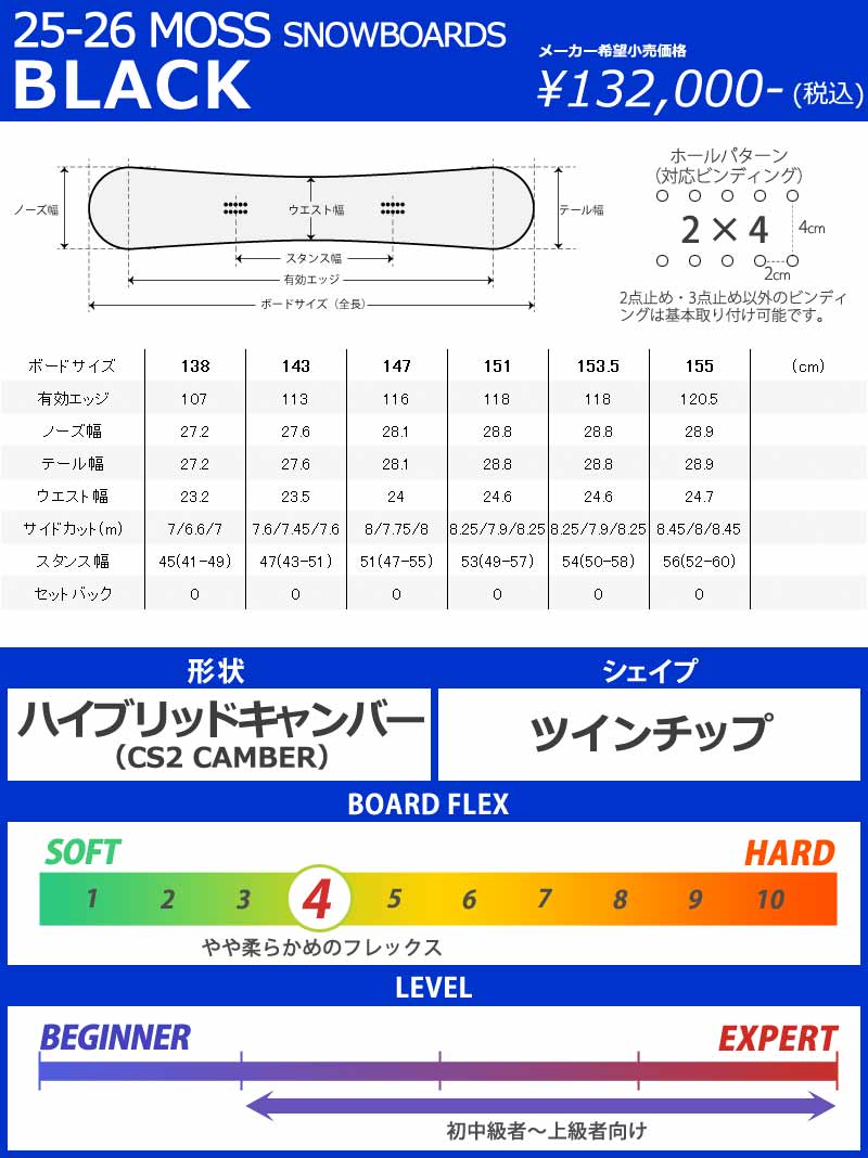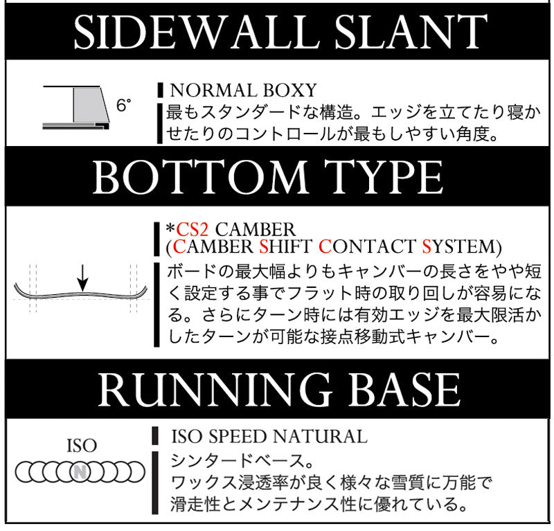 | 形状 | ハイブリッドキャンバー(CS2 CAMBER)ツインチップ |