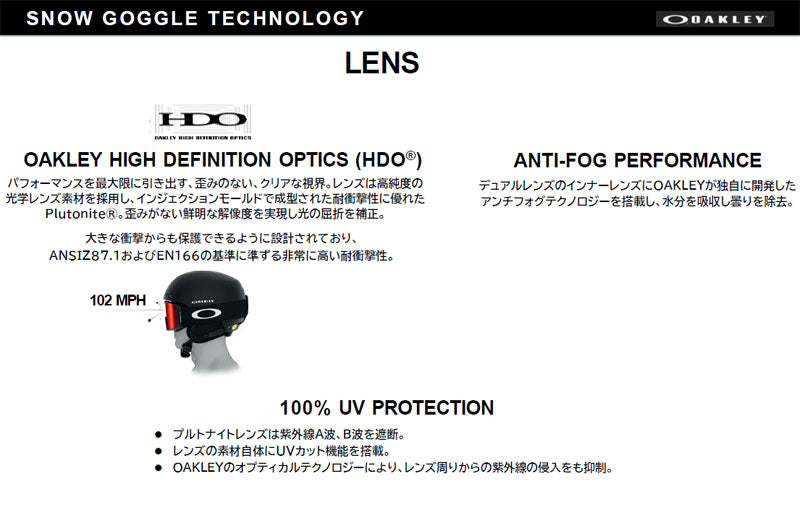 平面レンズを採用しながらも、周辺視野を究極まで確保する事を目的としてデザイン。まずゴーグル自体を薄く、さらにレンズをこれまでにないほど出来るだけ顔に近づける事で、下方向や横方向の視界を広げる事を可能。