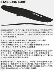 C195 SURFスタビライザーは、アスペクト比5.8、やや厚めのプロファイル設計により、スピードのコントロール性能に優れ、ポケットでのタイトなターンも軽快にこなせるスナッピーなライディングフィールを実現する。