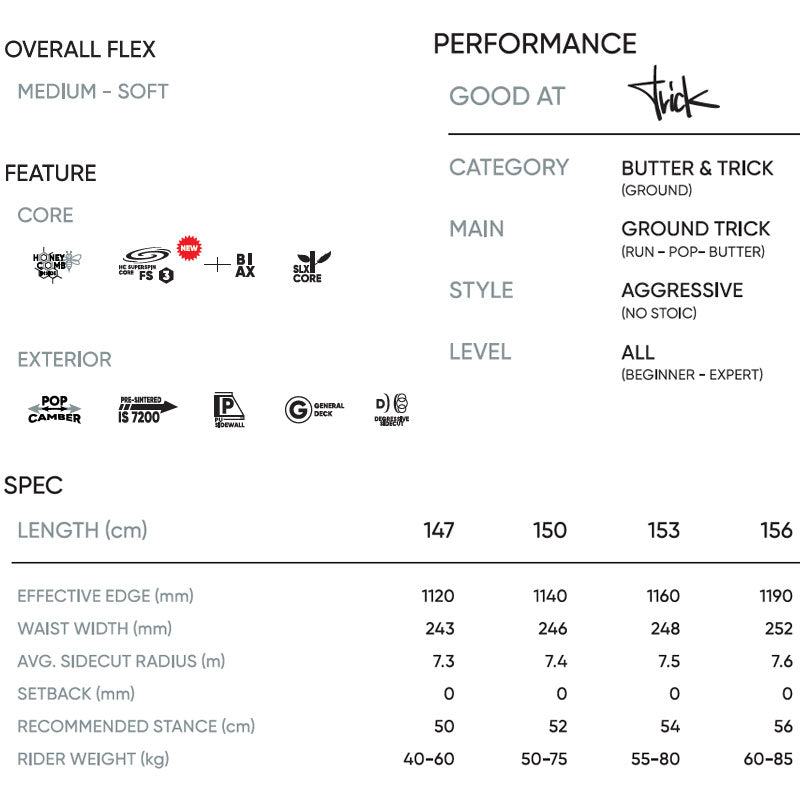 | 滑走適正スタイル | 1.グラトリ(グランドトリック) 2.ジブトリック(BOX&レール) 3.フリーラン 4.ワンメイク(キッカー) (スタイルや技術によって変化します) |