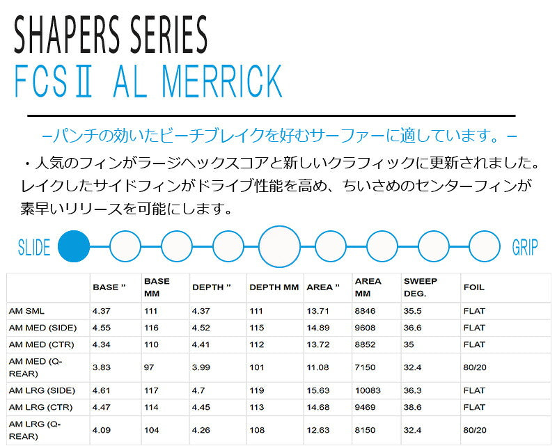 アル・メリックの「AM」シェイパーフィン。 レイクドサイドフィンが抜群のスピードとドライブを生み出します。 【概要】 ・アル・メリックのテンプレートは、ラディカルでプログレッシブなサーフィンのためにデザインされています。 ・ついにXLサイズがリリースされました。 この人気のアルメリックテンプレートは、大柄でパワーのあるサーファー向けに特別に作られたもので、ハイパフォーマンスのCIモデルや、深いコンケーブに適度から極端なロッカーを持つボードとシームレスにマッチします。 このフィンはラディカルでプログレッシブなサーフィンのためにデザインされ、ホローでスティープな波やパンチの効いたビーチブレイクで抜群のパフォーマンスを発揮します。 【理想的な条件】 ・ホロー・スティープ・ウェーブ、パンチの効いたビーチブレイクに適しています。 【ボードタイプ】 ・FCSIIフィンシステムに適合するように設計されています。 ・深いコンケーブと中~極端なロッカーを持つパフォーマンスボードに推奨されます。 【フィンファミリー】 ・カーバー: ファインドパワー。パワフルで伸びやかなターンと、ホールド感をプラス。 |