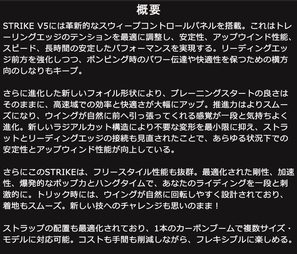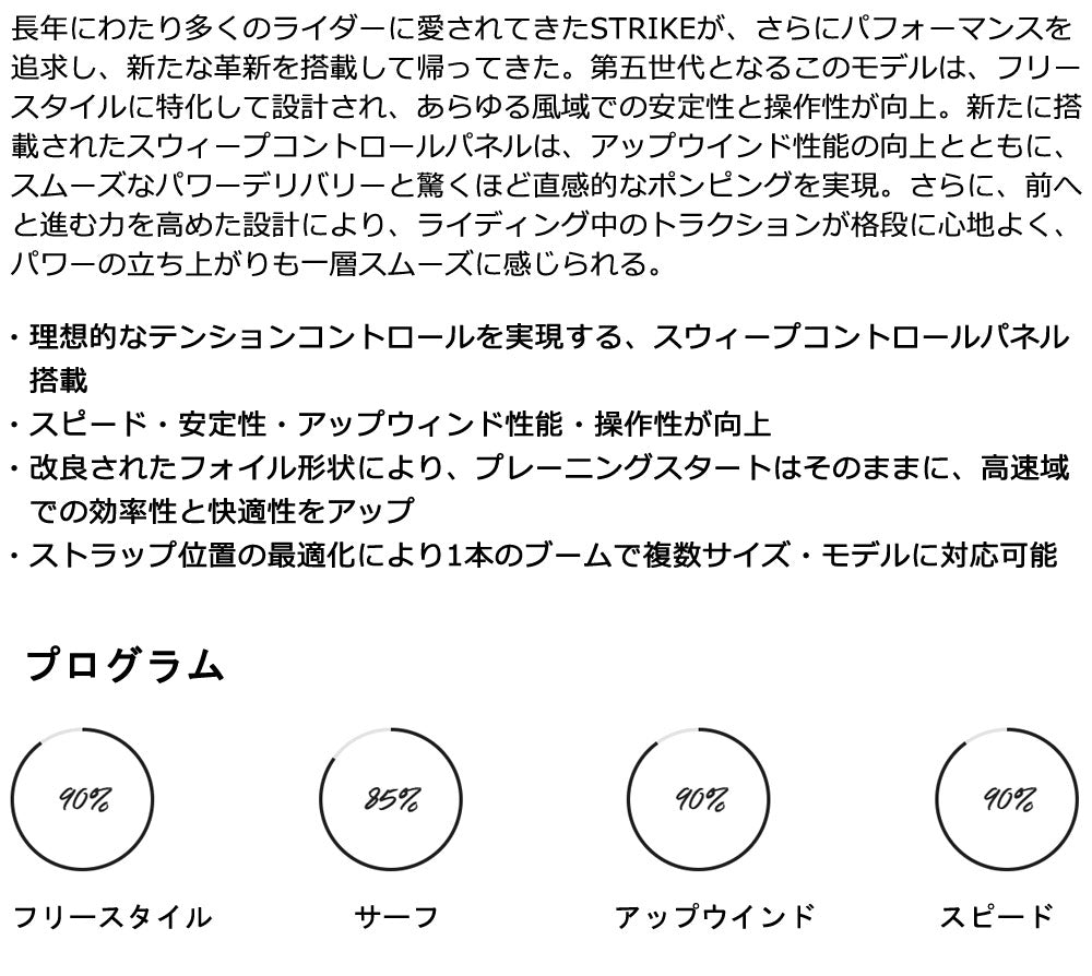 長年にわたり多くのライダーに愛されてきたSTRIKEが、さらにパフォーマンスを追求し、新たな革新を搭載して帰ってきた。 第五世代となるこのモデルは、フリースタイルに特化して設計され、あらゆる風域での安定性と操作性が向上。 新たに搭載されたスウィープコントロールパネルは、アップウインド性能の向上とともに、スムーズなパワーデリバリーと驚くほど直感的なポンピングを実現。 さらに、前へと進む力を高めた設計により、ライディング中のトラクションが格段に心地よく、パワーの立ち上がりも一層スムーズに感じられる。 ・理想的なテンションコントロールを実現する、スウィープコントロールパネル搭載 ・スピード・安定性・アップウィンド性能・操作性が向上 ・改良されたフォイル形状により、プレーニングスタートはそのままに、高速域での効率性と快適性をアップ ・ストラップ位置の最適化により1本のブームで複数サイズ・モデルに対応可能 ※ハンドルは付属しておりません。(別売り) ※予告なくデザイン、内容が変更される場合がございます。