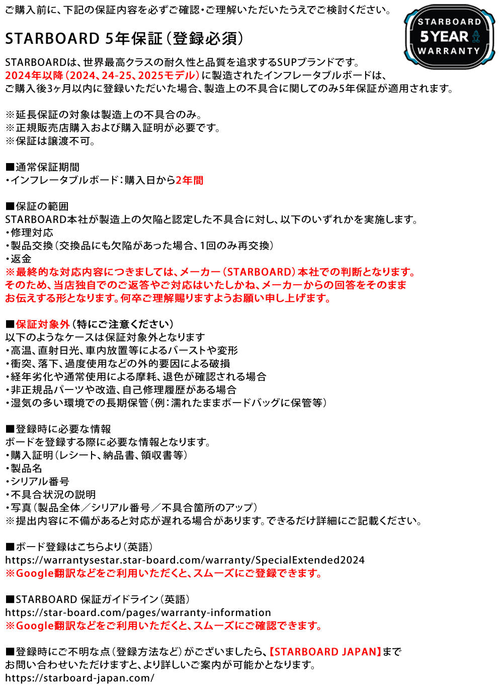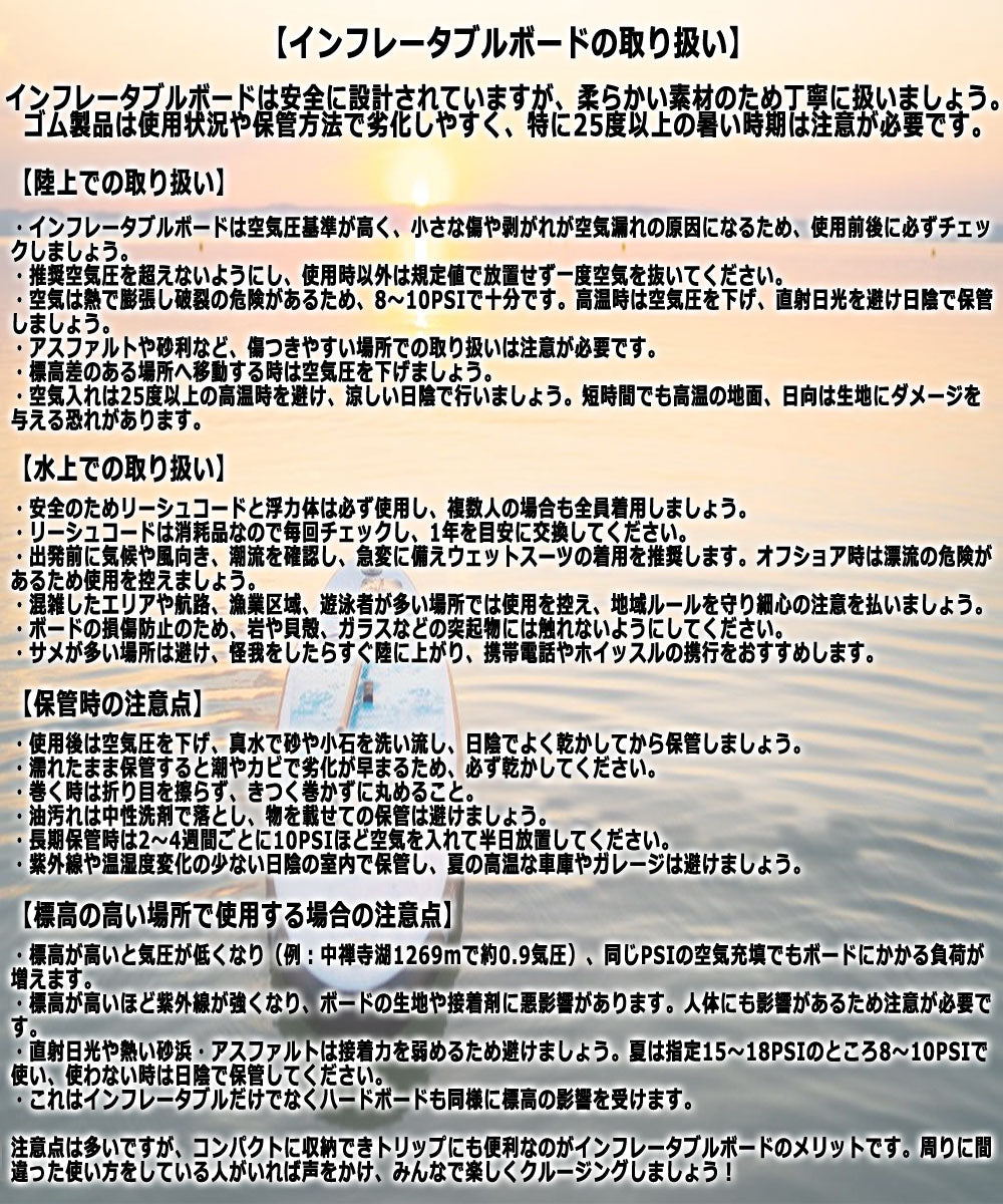 | 取り扱い注意 | 安全性のためSUPに乗られる際は、サーフィンと同様にリーシューコードの着用をお願いします。 また、空気注入式のため、必ずライフジャケットを着用してください。 万が一パンクした場合、危険が伴ため浮力体を着用の上、乗るようにして下さい。 |