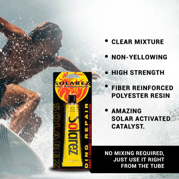 ■用途 ウレタンサーフボード ■用途説明 紫外線で硬化する簡易修理剤。 深さ1cmでのキズに対応。 硬化時間::約3分 仕上がり:クリア SOLAREZは、特殊なグラスファイバーが配合されたポリエステル樹脂で、紫外線(日光)により化学反応し、硬化する誰にも簡単に使える修理剤です。 今までの修理剤とは異なり、修理に必要な溶剤がいりません。紫外線に当たるまでは液体ですので日陰で作業すれば硬化する心配はありません。 修理箇所にSOLAREZを埋めて紫外線に当ててください。5秒で硬化し始め、3分で完全硬化します。 (硬化剤を使用する必要はありません。)猛暑の中でも極寒の中でも日光に対して同様に反応します。 |
